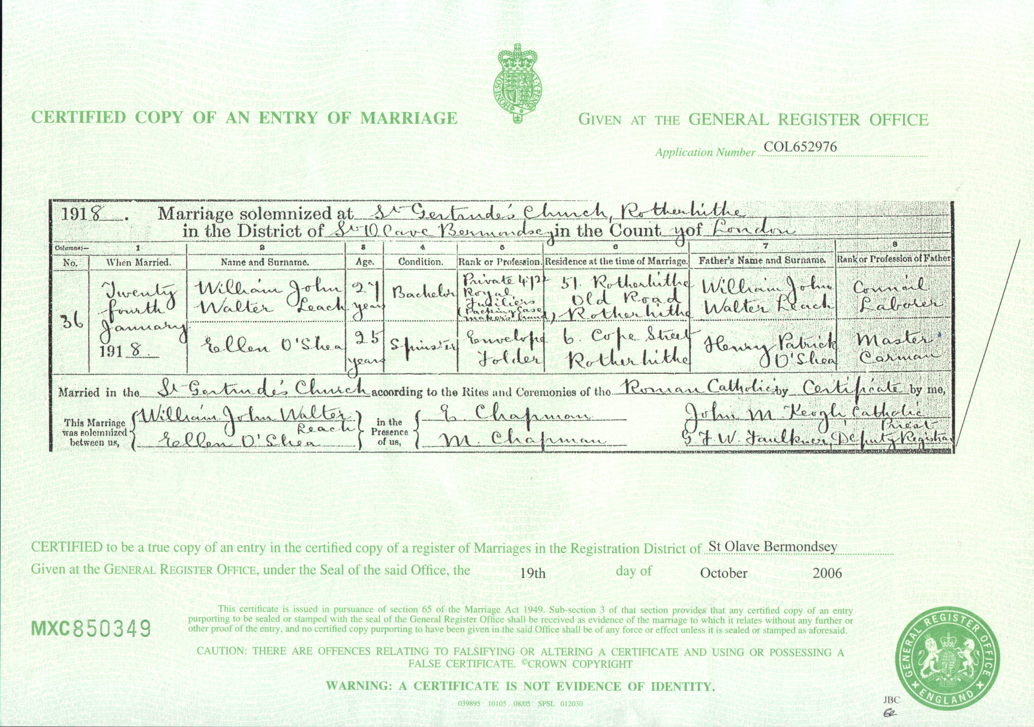 William John Walter Leach, Private 4722 in the Royal Fusiliers married