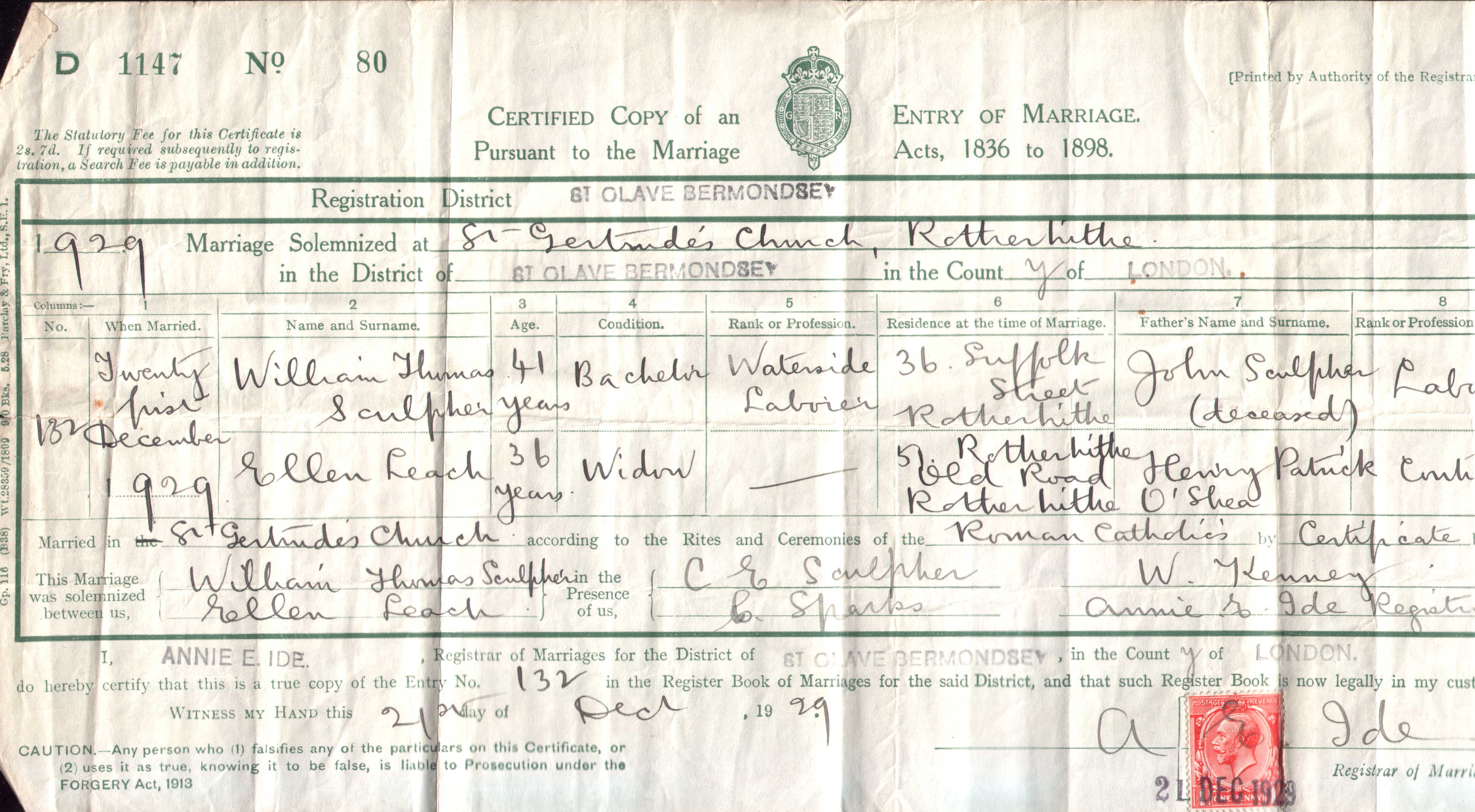 grandfather, William Thomas Sculpher in 1929. However Ellen had been