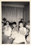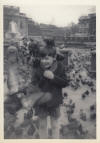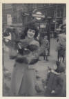| Mum being mobbed by pigeons in Trafalgar Square. I think I remember the coat Mum was wearing as being red in colour. This could be 1965. | My birthday party, taken at 35 Barringer Square, Tooting sometime in the 1960's, maybe when I was nine or ten, 1964 or 1965. In the first photograph I am on the extreme right and next to me is my best friend Martin Castle. The girl in the foreground is Josephine Bailey. In the right hand photo, the lad in the centre with the dark top is Derek Harris. I recognise other faces but unfortunately not their names. | |||