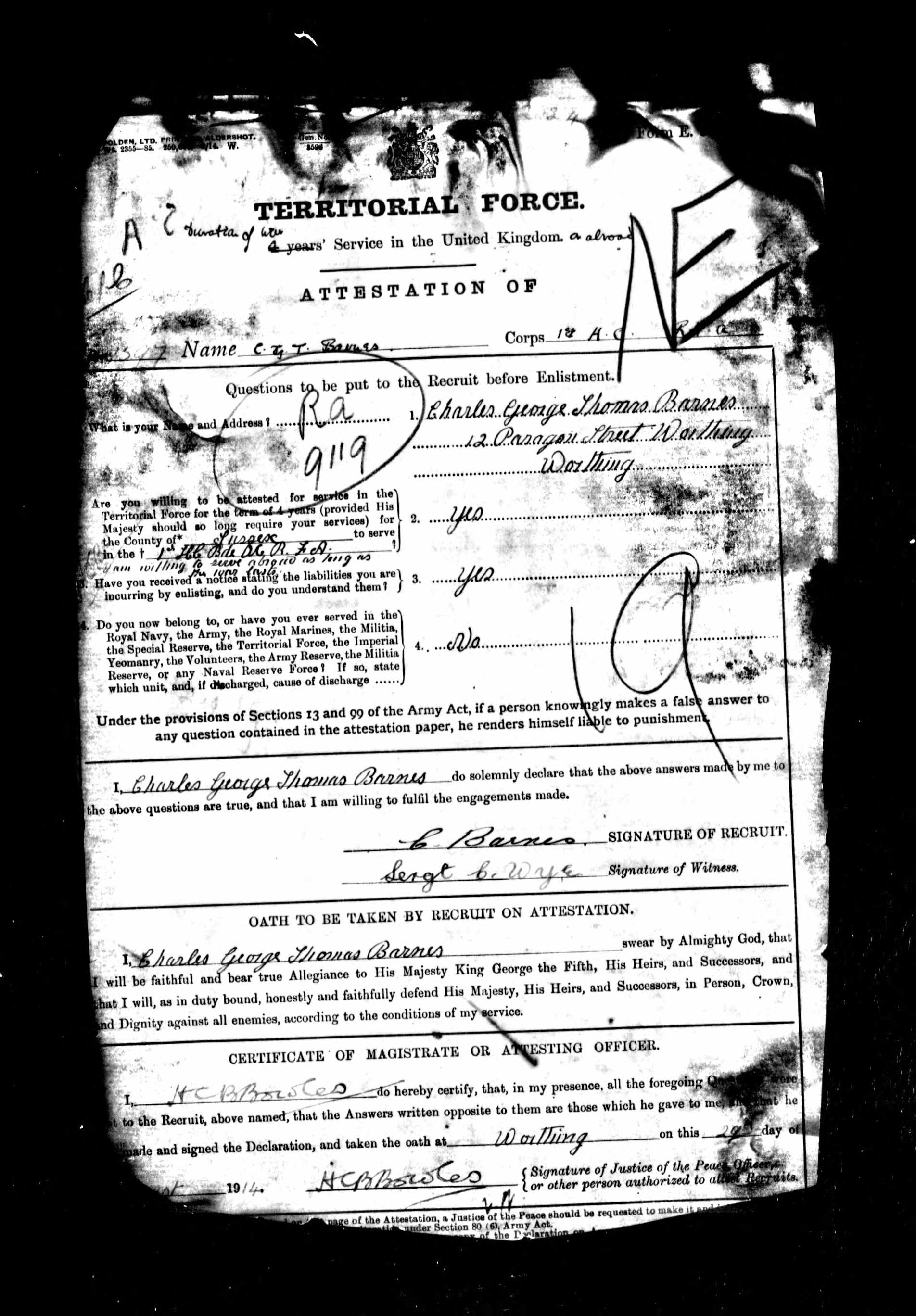 Attestation form, dated 29th August 1914. Paragon Street, Worthing, sadly no longer exists. It was demolished in 1961 and now shops and a bowling alley are on the site.