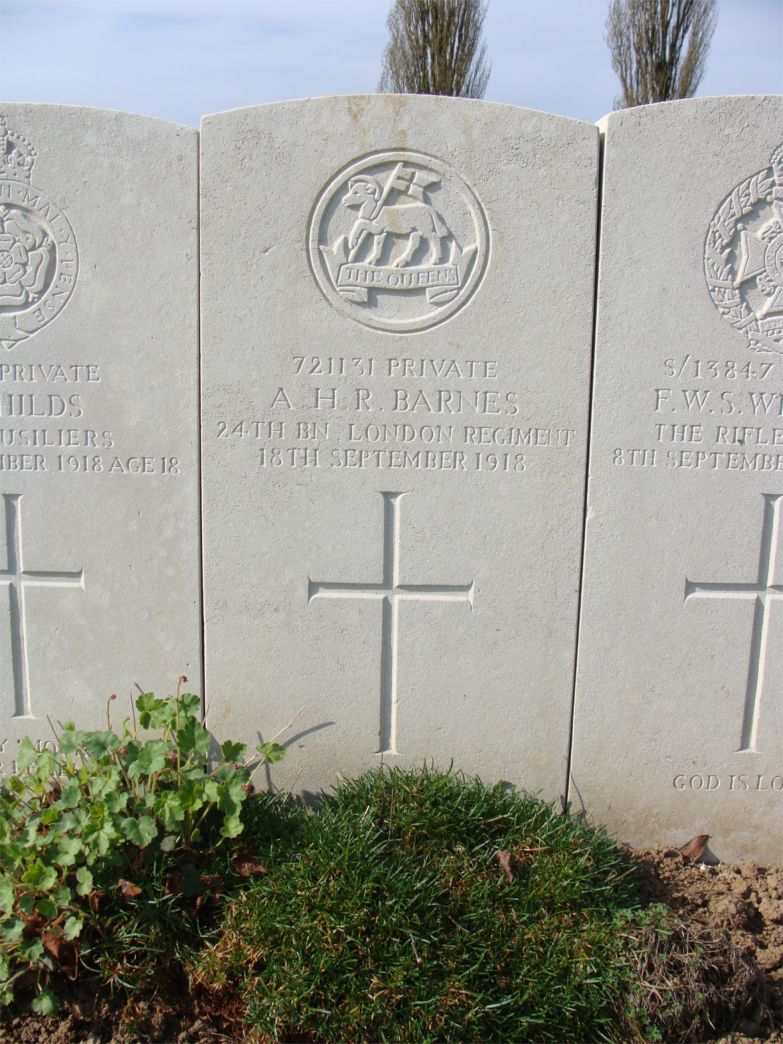 Herbert Robert Barnes, 24th Battalion The London Regiment Died France 18th September 1918 Epehy Wood Farm Cemetery Grave II.B.20 |