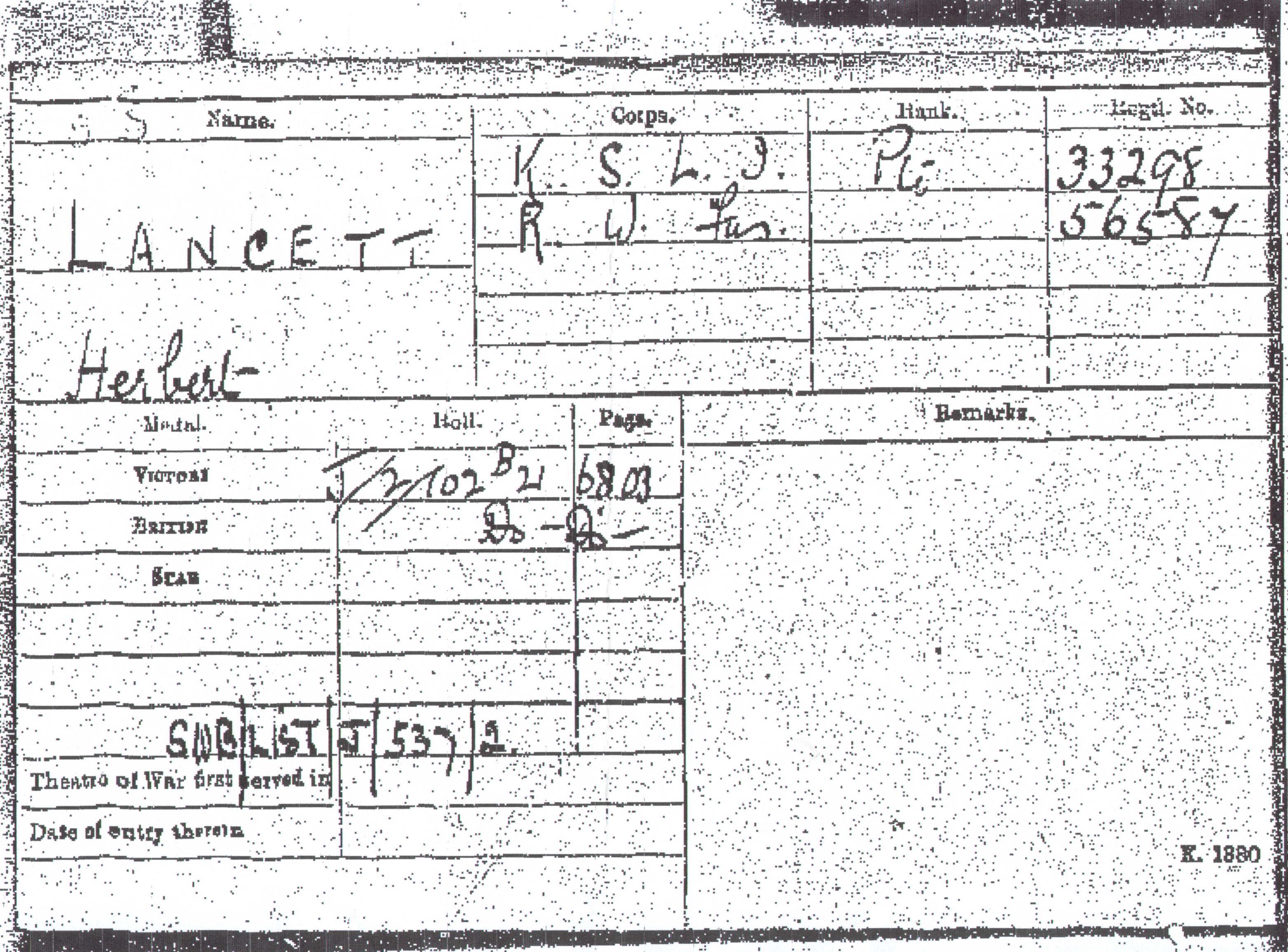 | The medal card of Private Herbert Lancett, serving first in the Kings Shropshire Light Infantry and later in the Royal Welsh Fusiliers. He qualified for the Victory and British medals only - not the 1914/15 Star, as although not entered on his medal card we know from the Silver War Badge role that he enlisted in the February of 1916. His date of discharge is also missing from the card but is listed on the Silver War Badge role. |
