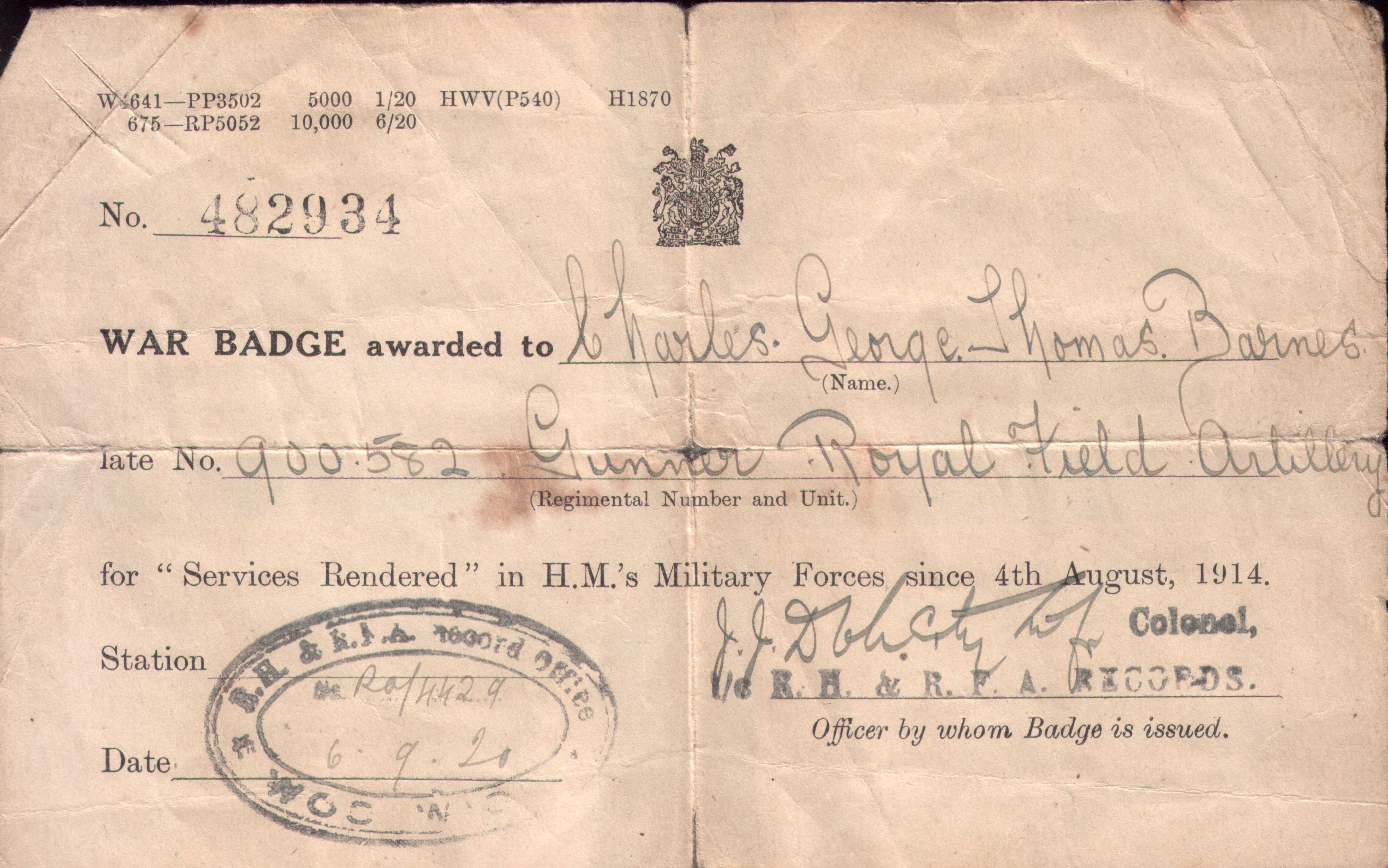 Gunner Charles George Thomas Barnes has sadly been lost - possibly in