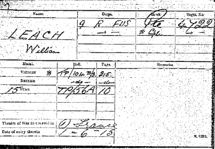 The medal card of William Leach from which we can see that he was a