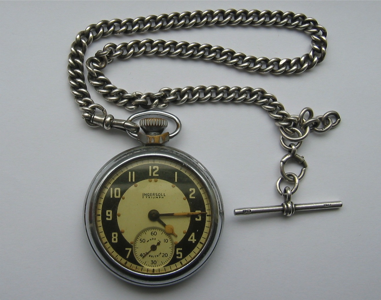 glass is yellowed. The watch is a Ingersoll Triumph manufactured sometime in the 1950's by the